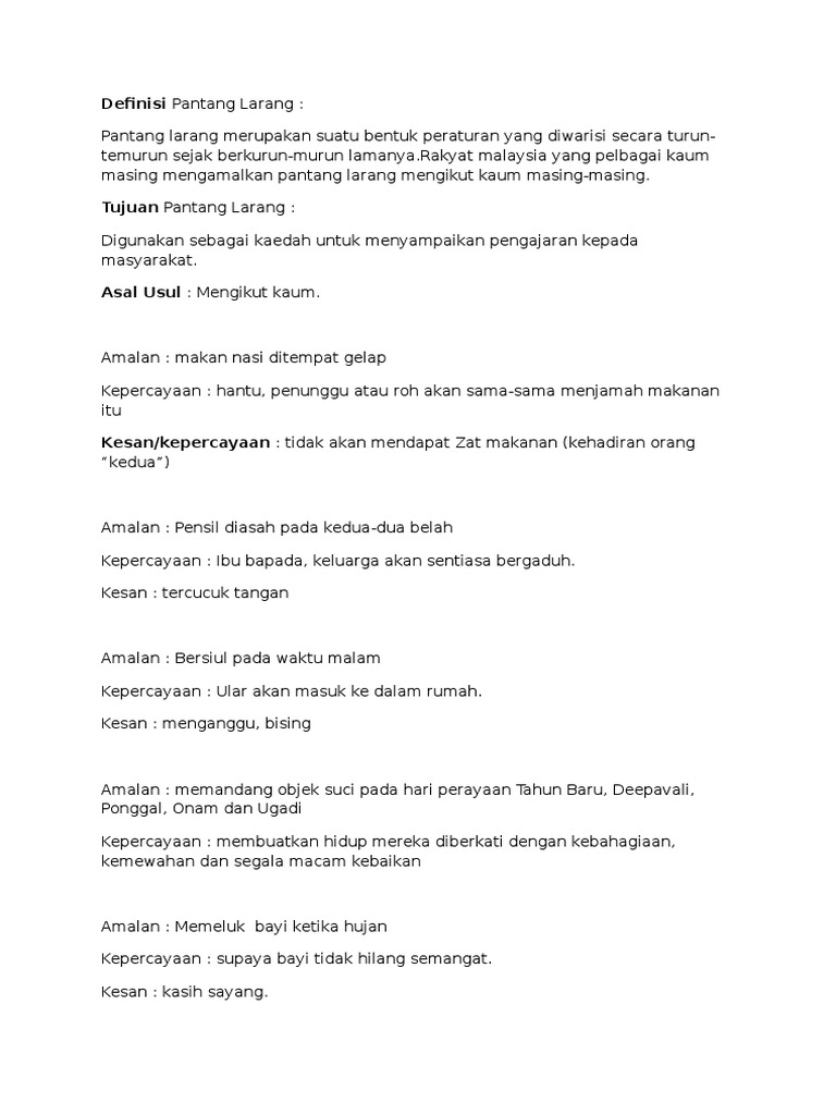 Terdapat pelbagai kaum di malaysia dan setiap kaum tersebut mempunyai pantang larang yang tersendiri.