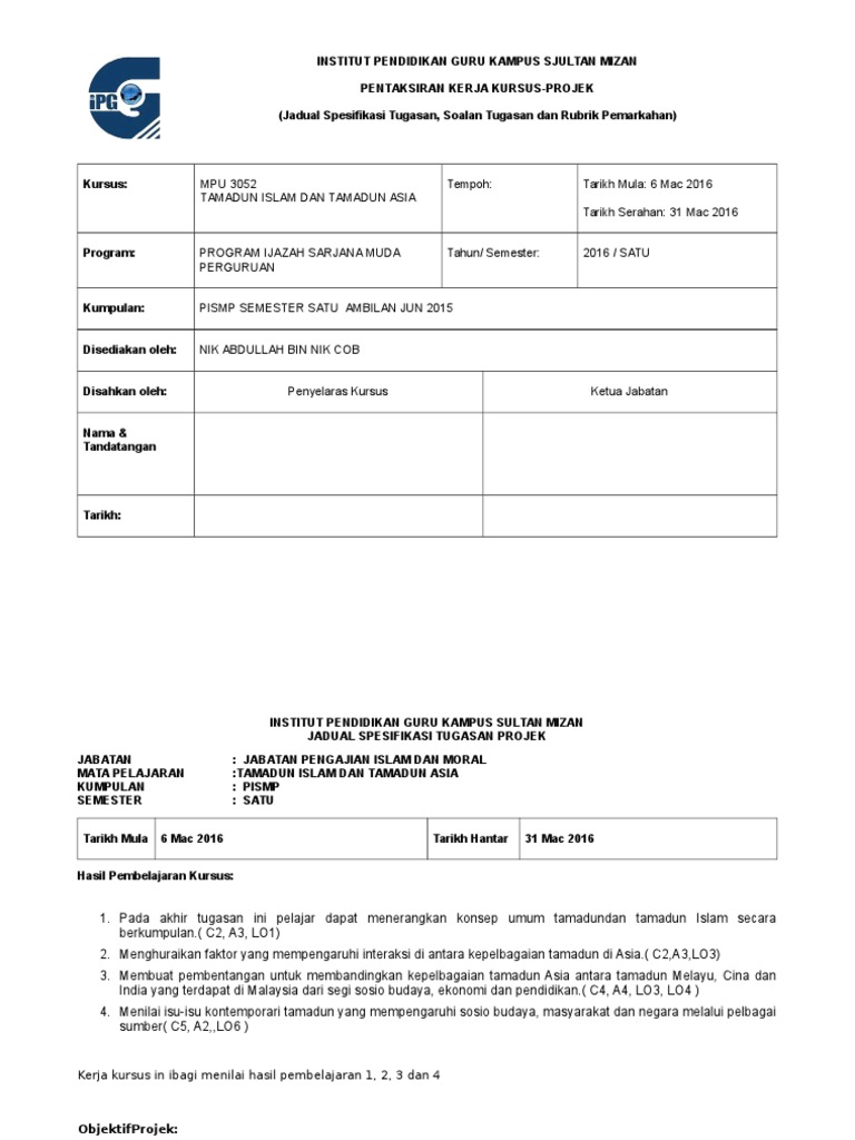 The way to success dimuatkan. Semasa melaksanakan tugasan kerja kursus pendek tamadun islam dan tamadun asia. Memandangkan malaysia terdiri daripada pelbagai kaum, menyebabkan. Hasil laporan yang terbaik mestilah menepati kehendak tugasan diberikan yang merangkumi tajuk kajian, nama penulis, penghargaan (jika perlu), isi kandungan, objektif kajian, kaedah kajian, hasil kajian, rumusan, lampiran. Contoh proposal kerja kursus 940/4.